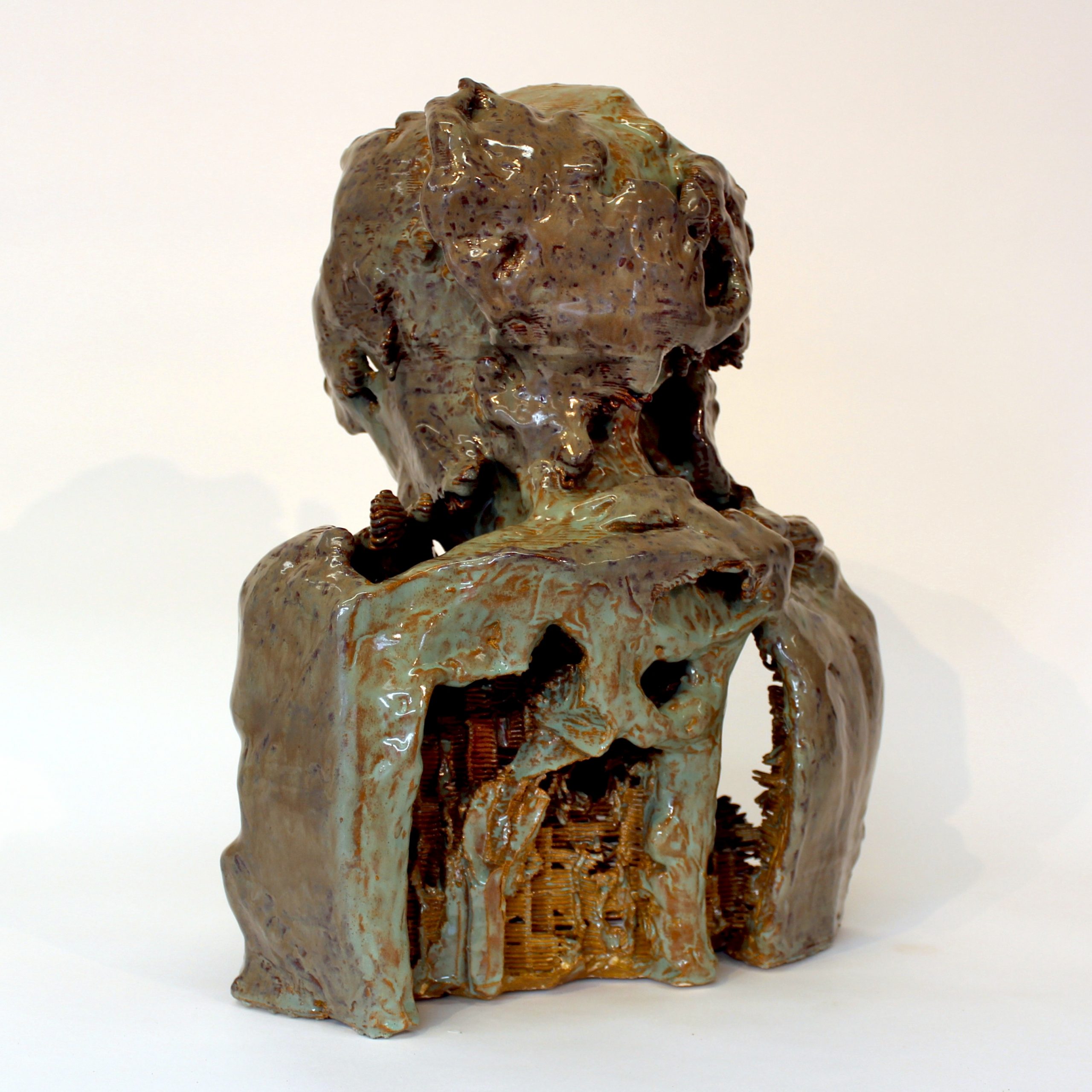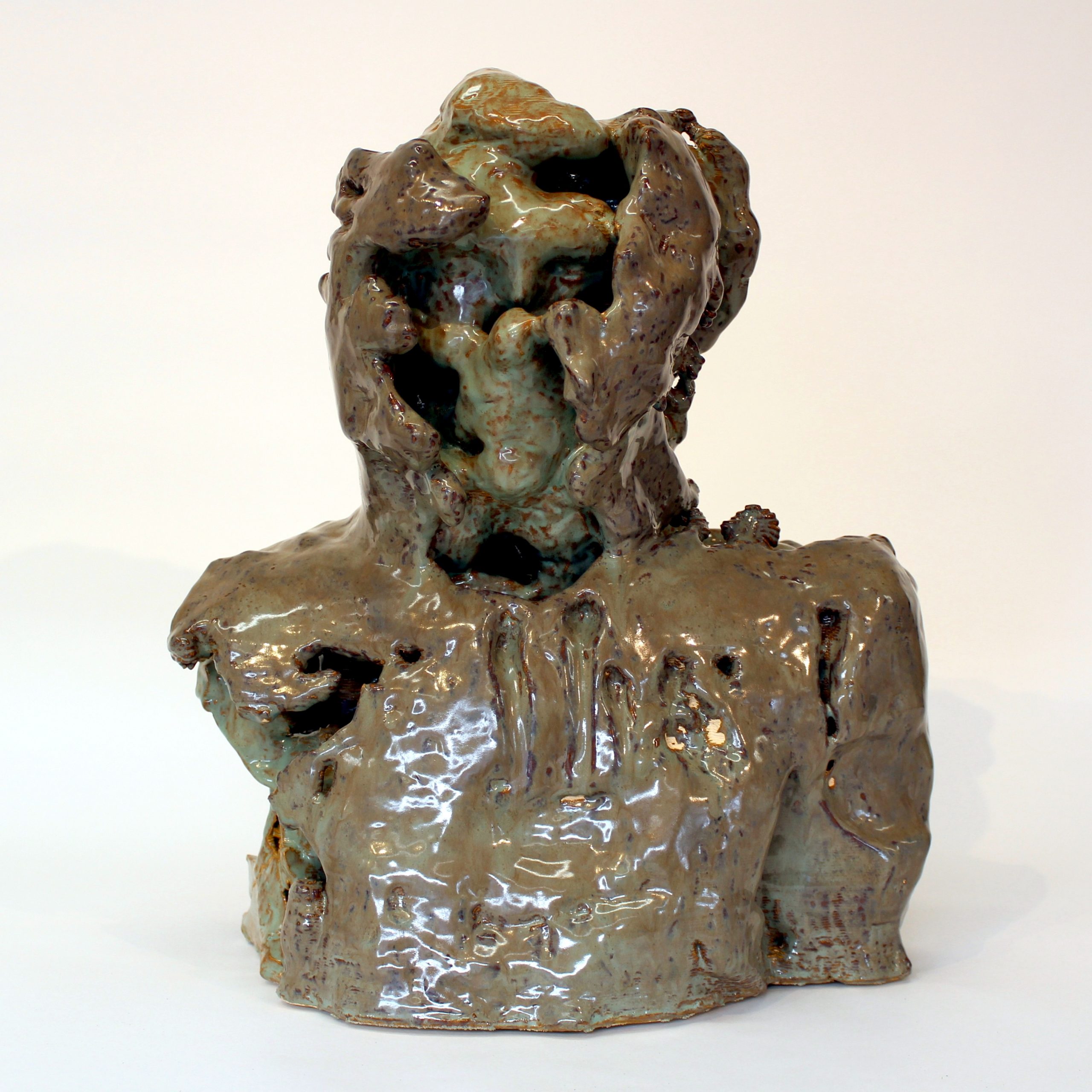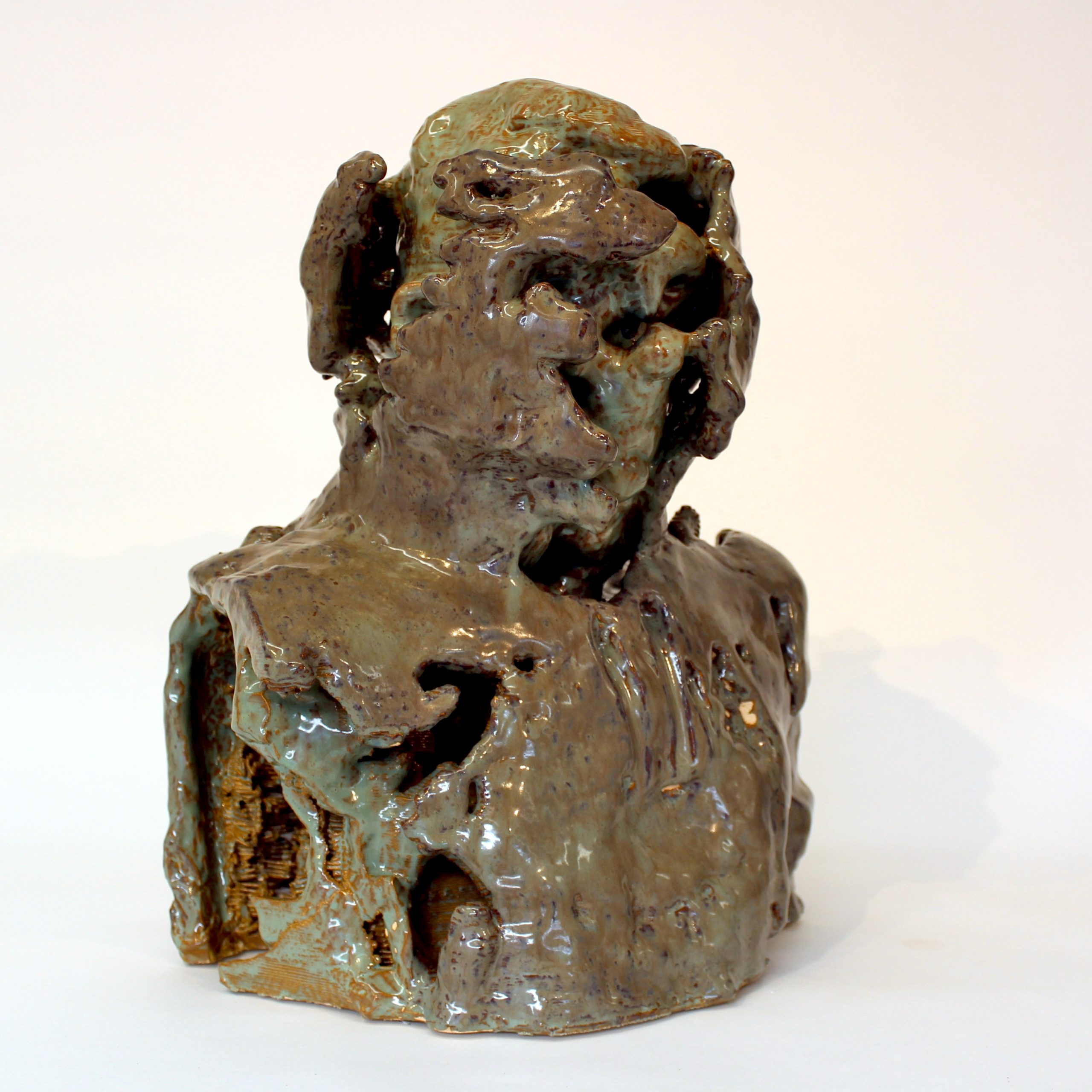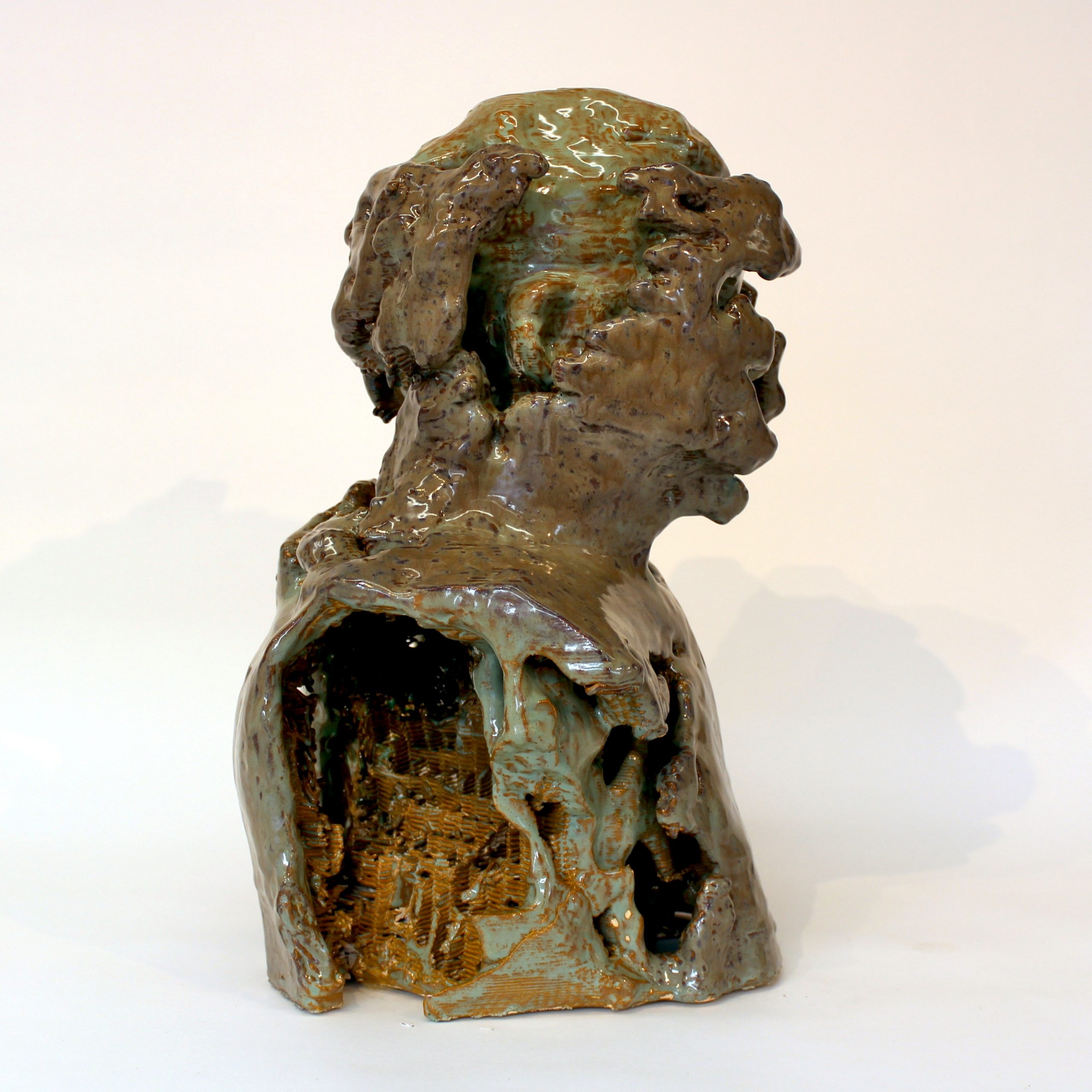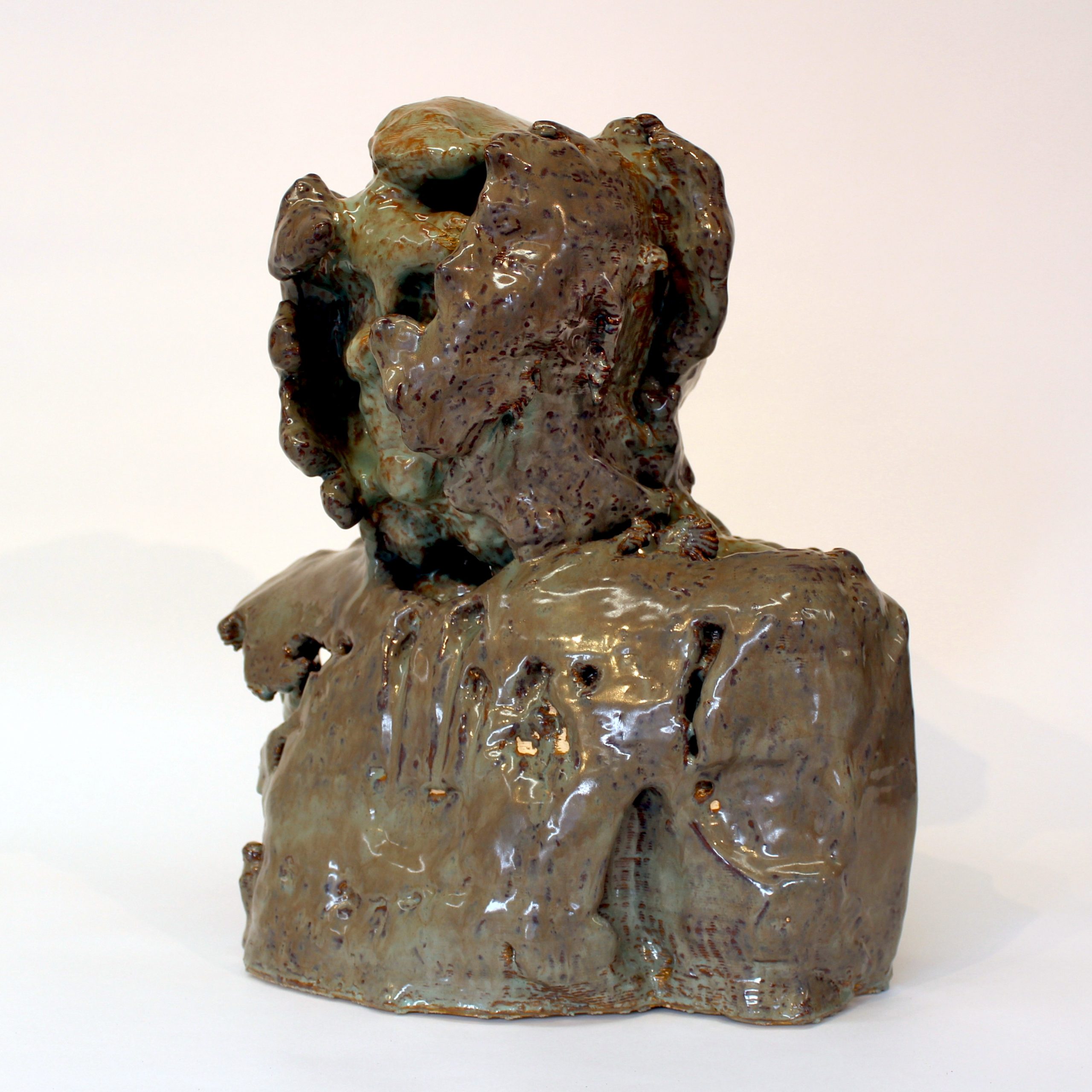 Die Absicht war es weiche Übergänge zu schaffen zwischen dem klar erkennbar modellierten Gesicht und den in Auflösung befindlichen Partien. Die Struktur des Druckvorgangs ist klar erkennbar und verleiht der Skulptur einen tektonischen Charakter. Die Farbe ist von algenbewachsenen Küstenfelsen inspiriert an deren erodierte Formen mich die Skulptur erinnerte.